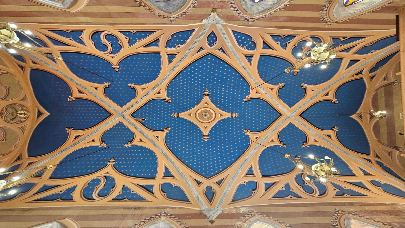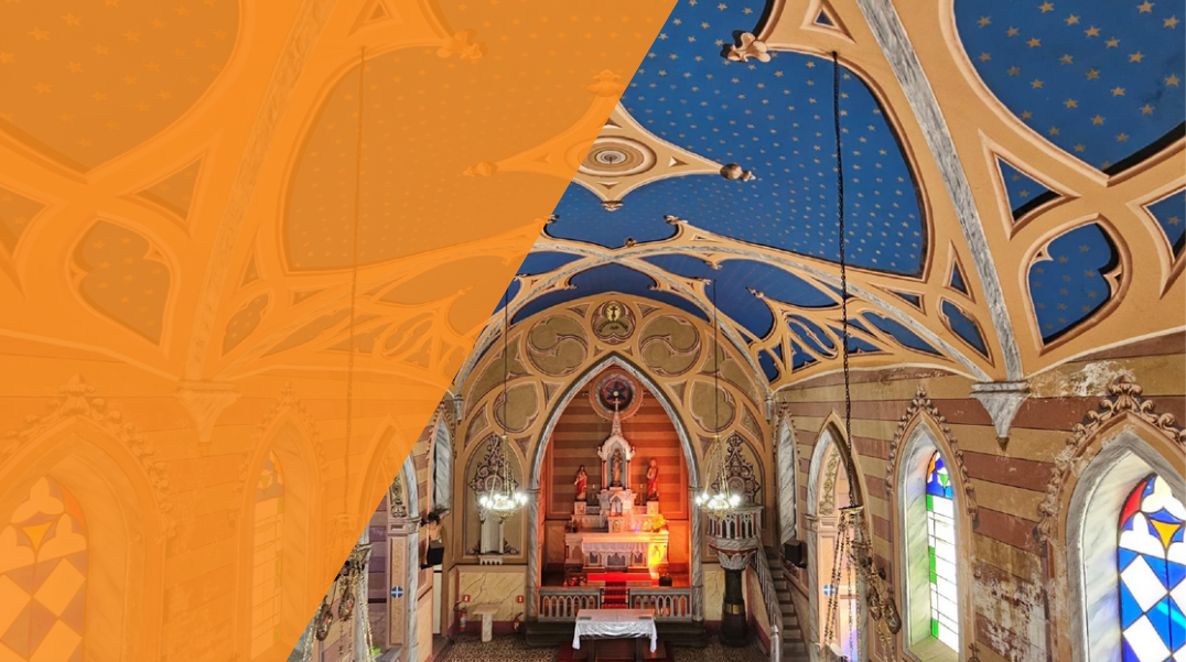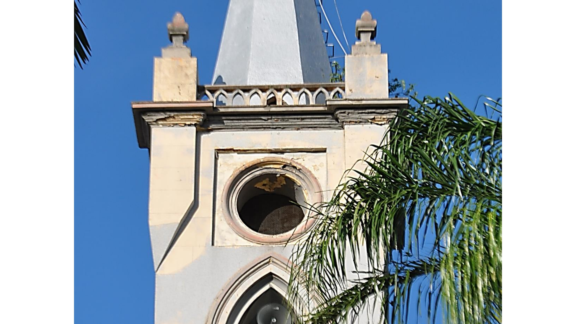 Inicia-se agora o processo de restauração das telhas metálicas, com foco no restauro dos pontaletes de madeira, possíveis substituições, regularização das partes de alvenaria que suportarão as calhas, ajustes necessários, e a troca da rede elétrica, incluindo a revisão do sistema de para-raios. Além disso, será realizado o restauro de pontos danificados no forro, estuques fasquiados artísticos, e atenção especial ao cuidado da pintura artística interna prejudicada por infiltração de água pluvial e ninhos de pombas nas calhas. O cuidado geral estenderá-se às fachadas externas, que estão completamente danificadas.